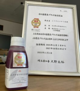 ムラサキマサリ甘酒が「彩の国優良ブランド品」に認定されました。